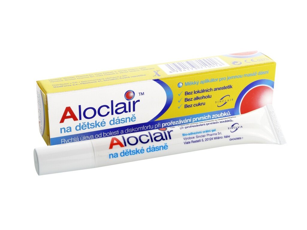 Aloclair gel na dětské dásně, zdravotnický prostředek, je bio-adhezivní ústní gel, který příznivě a blahodárně působí na dásně v období prořezávání prvních zubů. Aplikátor je opatřen silikonovými štětinkami, které dásně jemně masírují.