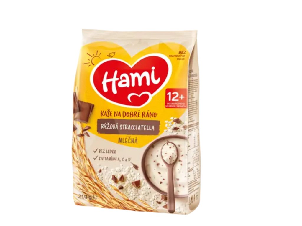 Rýžová mouka 42,7 %, sušené odtučněné mléko 22,4 %, demineralizovaná syrovátka (z mléka), kousky mléčné čokolády (cukr, kakaové máslo, sušené plnotučné mléko, kakaová hmota, přírodní vanilkové aroma) 10 %, rostlinné oleje (slunečnicový, řepkový, slunečnicový s vysokým obsahem kyseliny olejové, kokosový), cukr, přírodní aroma, minerální látky (uhličitan vápenatý, difosforečnan železitý, jodid draselný), maltodextrin - z brambor, vitamíny (kyselina L-askorbová - vit. C, DL-α-tokoferylacetát - vit. E, retinylacetát - vit. A, cholekalciferol - vit. D, D-biotin, thiamin mononitrát - vit. B1, pyridoxin hydrochlorid - vit. B6).Bez lepku.Složení se vztahuje k sušenému stavu potraviny.