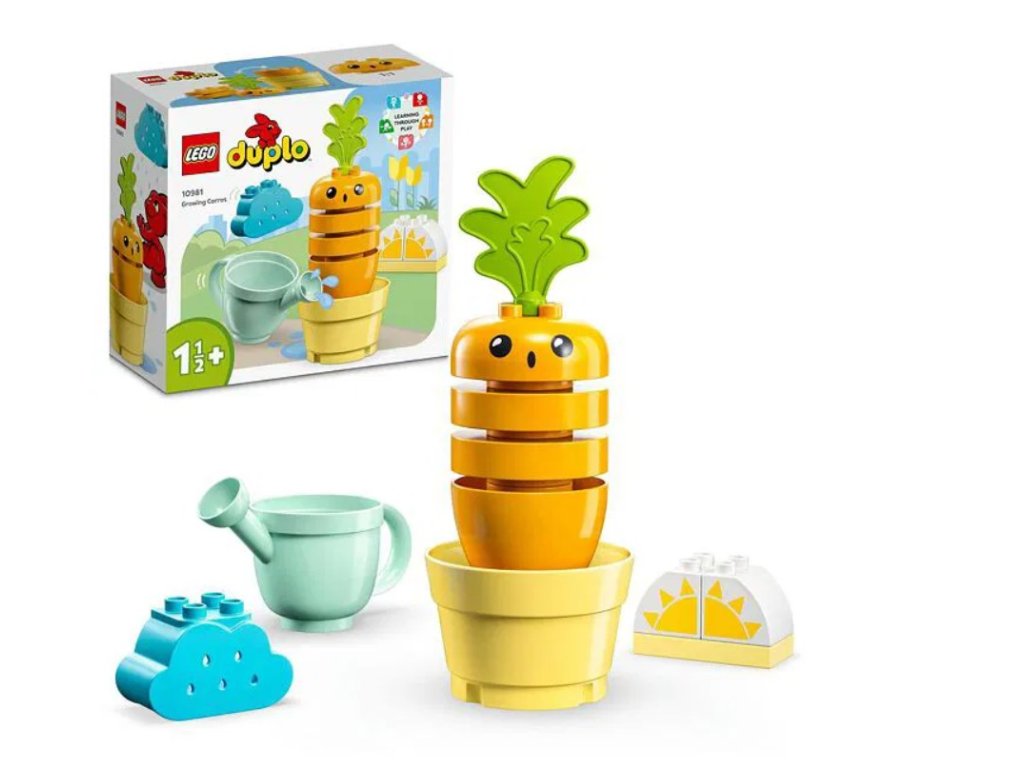 Pomozte nejmenším stavitelům trénovat skládání kostek a seznamte je s tím, jak se pěstuje zelenina, s pomocí této barevné stavebnice s mrkví.