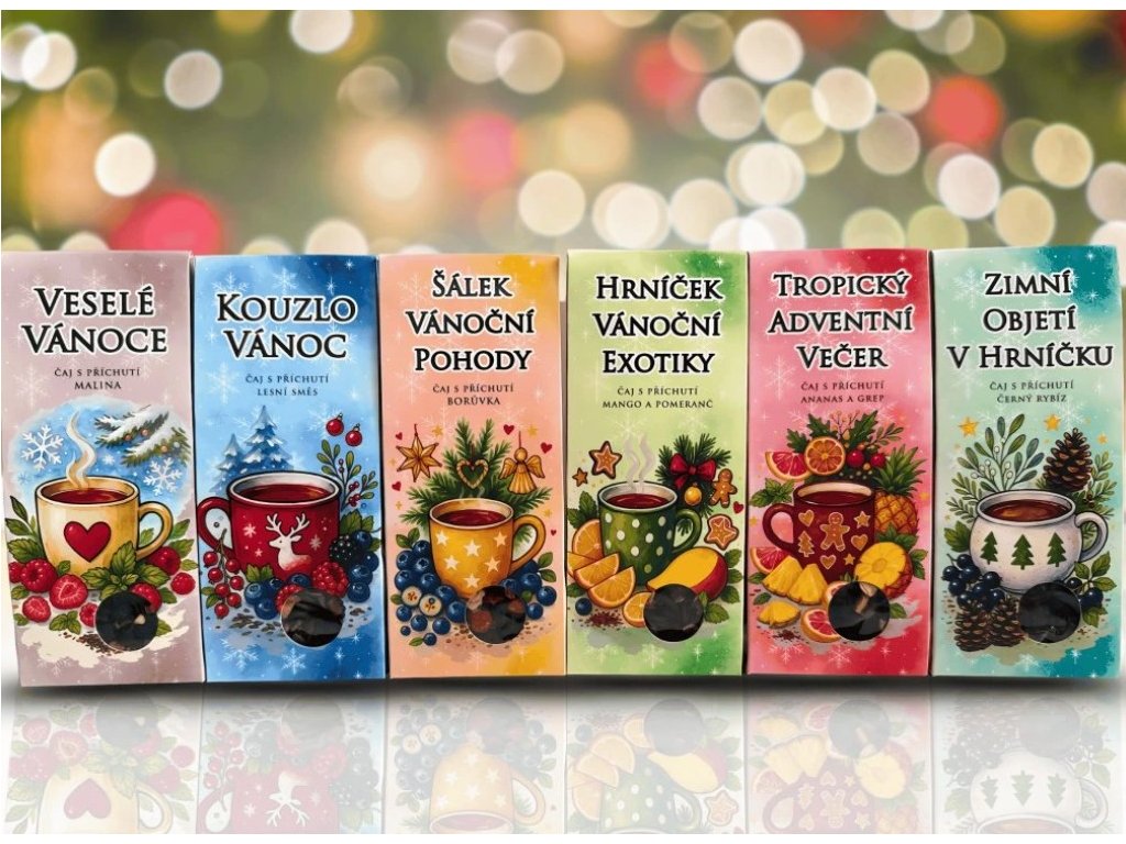 Šest vánočních sypaných čajů v dárkovém balení – malina, lesní směs, mango, ananas i další. Tyto šťavnaté chutě a voňavé kombinace vykouzlí teplo domova i jako dárek. Ideál pro Vánoce & Mikuláše.