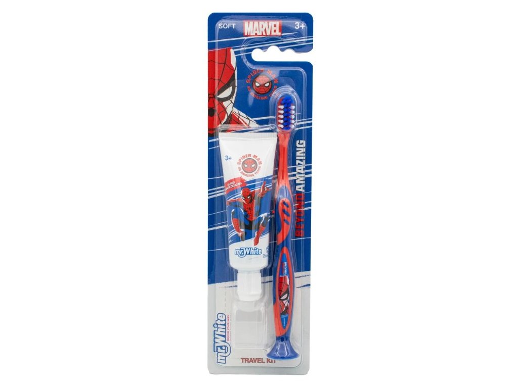 Cestovní sada Mr. White obsahuje zubní kartáček s motivem Spidermana, krytku a dětskou zubní pastu o objemu 25 ml. Zubní kartáček má malou hlavu osázenou jemnými štětinkami, které jsou vhodné k čištění mléčných zubů dětí od 3 let. Šetrně ale efektivně stírají nečistoty i zubní plak, ale zároveň respektují citlivé dětské dásně. Kartáček má na spodní straně přísavku a v balení naleznete i krytku hlavice, díky kterým bude kartáček vždy po ruce a v hygienické čistotě. Jemná dětská pasta se svěží mátovou příchutí šetrně čistí první dětské zoubky a pomáhá je chránit před vznikem zubního kazu díky obsahu fluoridu sodného (450ppm F). Celá sada potěší veselým designem obzvlášť milovníky akčních hrdinů.
