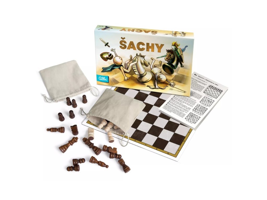 Hra Šachy obsahuje: 32 dřevěných figurek, 2 látkové pytlíky, šachovnici a pravidla.