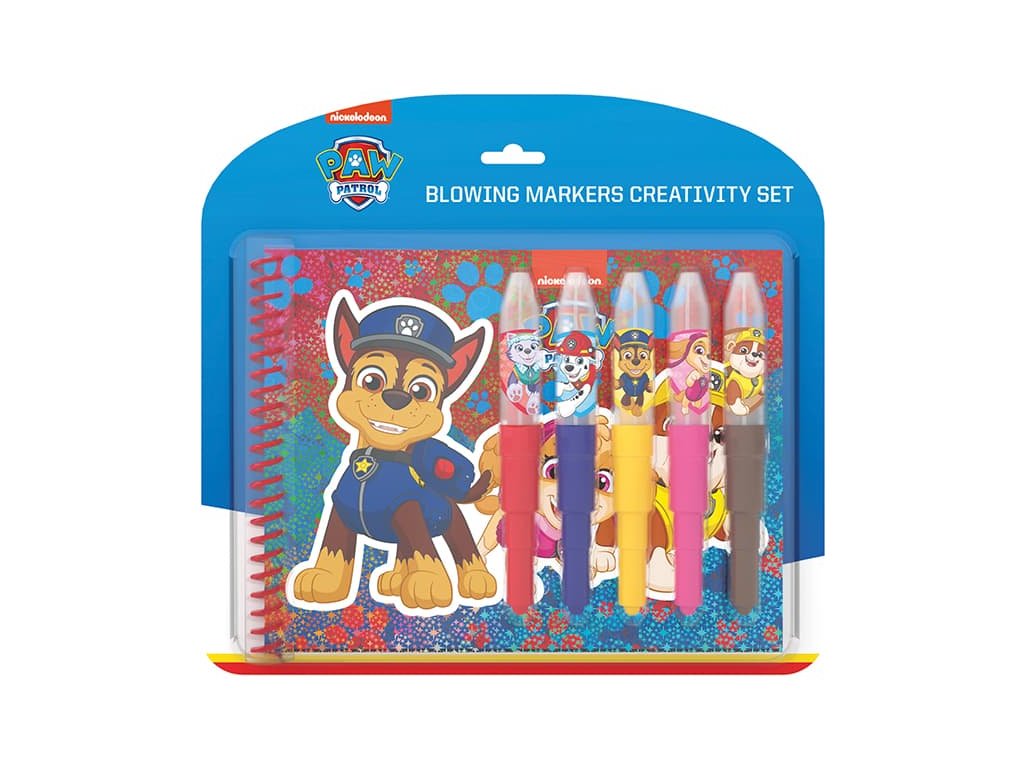 Set obsahuje 5 barevných foukacích fixů s potiskem, sešit s obrázky k vybarvení a plastovou šablonku.