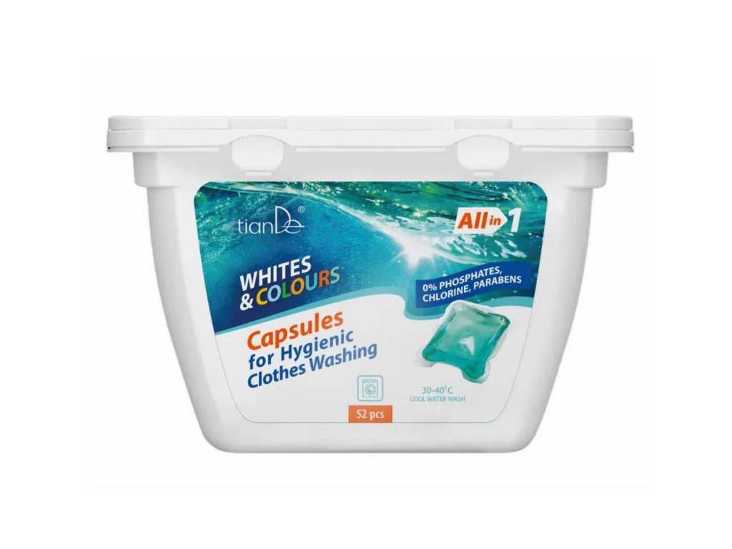 Kapsle na hygienické praní tianDe pro dokonale čisté a svěží prádlo. Koncentrát v rozpustných kapslích účinně odstraňuje mastné a bílkovinné nečistoty, zápach potu a zajišťuje dlouhotrvající svěžest. Vhodné pro všechny druhy tkanin - bavlnu, len, syntetické i směsové materiály. Pro barevné i bílé prádlo. Balení obsahuje 52 kapslí. Bez fosfátů a chlóru pro šetrné praní s maximální účinností.