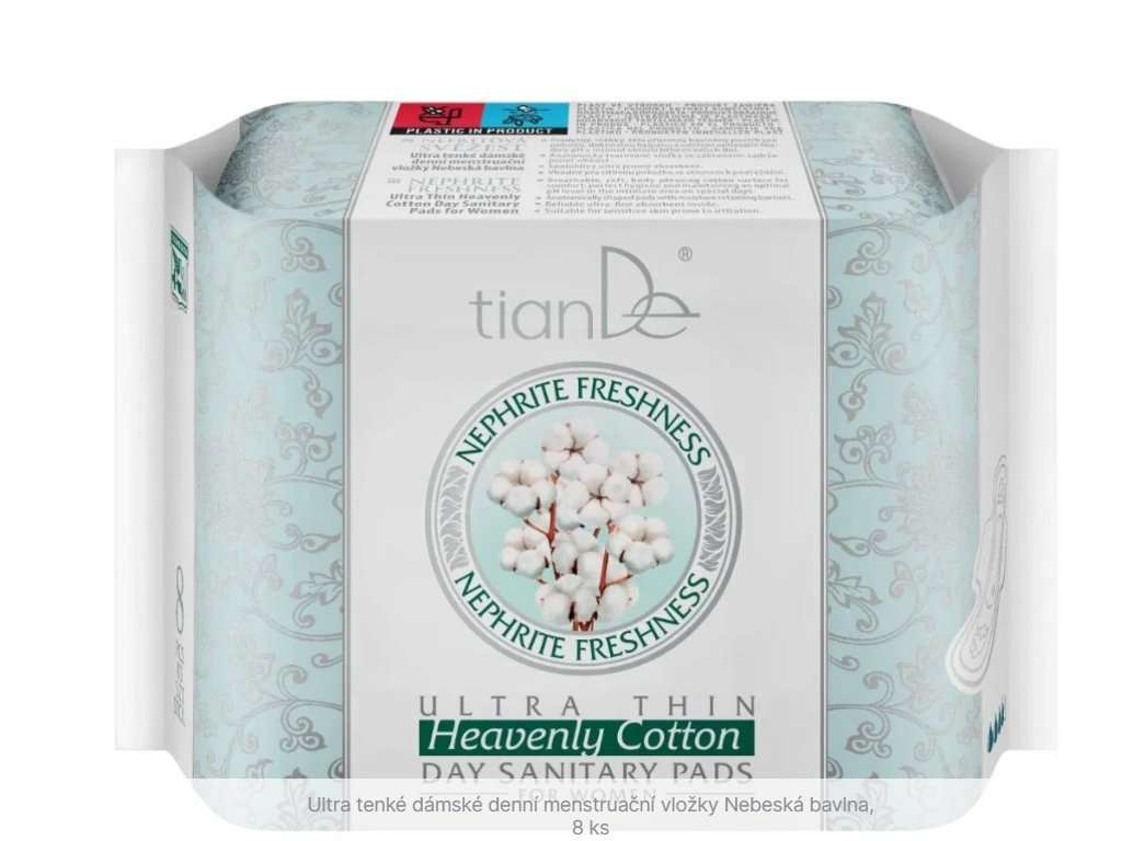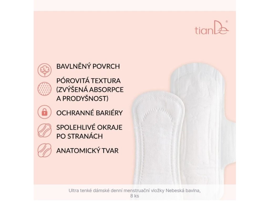 Ultra tenké denní menstruační vložky Nebeská bavlna tianDe poskytují komfort během menstruace díky prodyšnému bavlněnému materiálu, který je jemný k pokožce. Jejich ultra tenký design zajišťuje neviditelnost pod oblečením, zatímco anatomický tvar s bariérami spolehlivě zadržuje vlhkost. Vložky eliminují zapařování, podporují optimální pH intimní oblasti a nabízí vysokou absorpci. Vhodné pro všechny ženy a dívky včetně těhotných, ideální pro citlivou pokožku. Balení obsahuje 8 ks jednotlivě balených vložek.