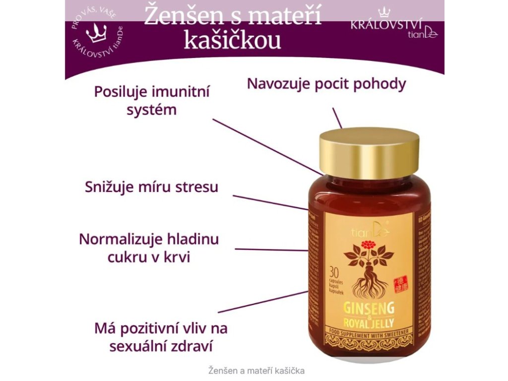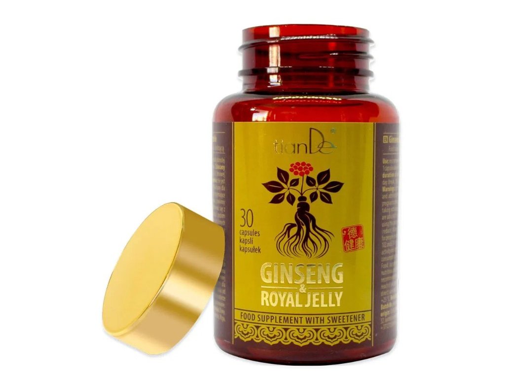 Podpora vitality a sexuálního zdraví v kapslích tianDe Ženšen a mateří kašička. Kombinace "krále bylin" ženšenu a mateří kašičky tradičně posiluje imunitní systém, dodává energii a pomáhá zvládat stres. Může přispívat k podpoře sexuálního zdraví, zejména u mužů, a k udržení normální hladiny cukru v krvi. Vhodné pro ženy i muže všech věkových kategorií, nevhodné pro děti, těhotné a kojící ženy. Balení 30 kapslí na měsíční kúru.