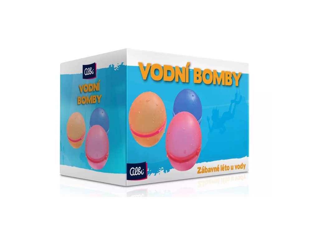Sada Vodní bomby obsahuje: 6 barevných magnetických vodních bomb (1 modrou, 1 žlutou,1 oranžovou, 1 červenou, 1 bílou a 1 zelenou).